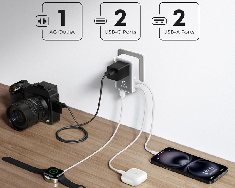 ANKER Nano 20W putni zidni punjač 5-portova (2x USB-A, 2x USB-C, utičnica EU na US, UK, AU i EU), beli