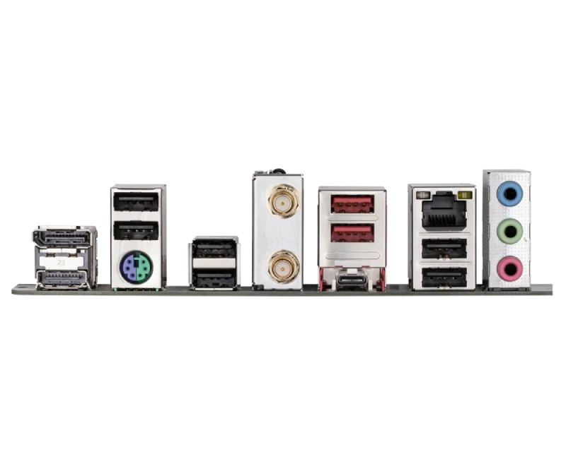 Priključci na zadnjem panelu Broj DisplayPort priključaka: 1, DisplayPort priključci: 1x DisplayPort, Broj HDMI priključaka: 1, HDMI priključci: 1x HDMI, PS/2: 1 (tastatura ili miš), Ukupno USB priključaka: 9, Ukupno USB-C priključaka: 1, USB-A priključci: 2x USB 10Gbps (3.2 Gen 2), 6x USB 2.0, USB-C priključci: 1x USB 5Gbps (3.2 Gen 1), RJ-45 (LAN): 1, Audio: 3x 3.5mm, Ostali priključci: 2 x SMA antenna connectors (1T1R),