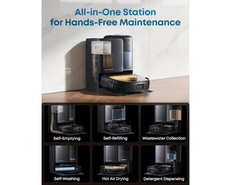 Dodatne funkcije: Automatsko pražnjenje prašine, Automatsko punjenje, Glasovna kontrola, Inteligentno izbegavanje prepreka, Automatsko sušenje i čišćenje mopa u bazi, Kontrole na dodir, Automatsko doziranje tečnog deterdženta, Mapiranje više spratova, Pametna detekcija nečistoća, Napomena: Upravljanje pomoću aplikacije, Wi-Fi IEEE 802.11b/g/n 2.4GHz, Dva rezervoara, za čistu i prljavu vodu, Za održavanje prostora do 150 m2, Funkcija čišćenja tepiha, Odvojiva baza, Podržane tehnologije: HydroJet™, DuoSpiral™, CornerRover tehnologija, Zero-Tangle dizajn,