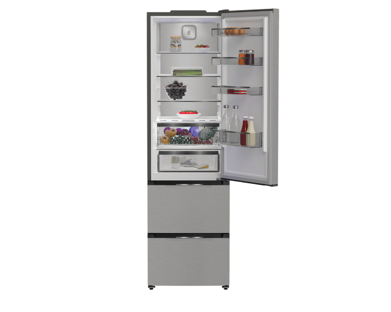 Zapremina: 351l (249l frižider; 102l zamrzivač), Visina: 203.5cm, Širina: 59.5cm, Dubina: 66.3cm, Broj vrata: 3, Dimenzije: 2035mm x 663mm x 595mm, Težina: 76.1kg, Dužina kabla: 1.9m, Materijal: Staklo, Boja: Srebrna,